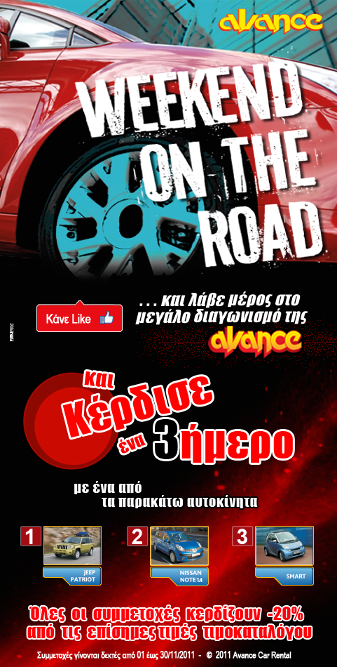Η Avance Greece διοργανώνει διαγωνισμό και σας δίνει τη δυνατότητα να κερδίσετε ένα 3ήμερο με ένα από τα αυτοκίνητα της AVANCE CAR RENTAL.Ένα Jeep Ptriot, ένα αυτοκίνητο 1400cc και ένα Smart.