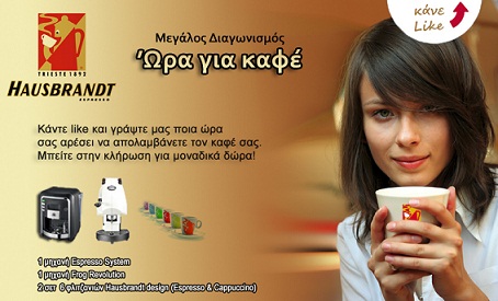Η εταιρία AVEK διοργανώνει το διαγωνισμό με τίτλο “Ωρα για καφέ” και σας δίνει τη δυνατότητα να κερδίσετε 1 μηχανή Espresso System + 1 κιβώτιο κάψουλες, 1 μηχανή Frog Revolution + 1 κιβώτιο ταμπλέτες, 1 σετ 6 φλιτζανιών Hausbrandt design Espresso και 1 σετ 6 φλιτζανιών Hausbrandt design Cappuccino.