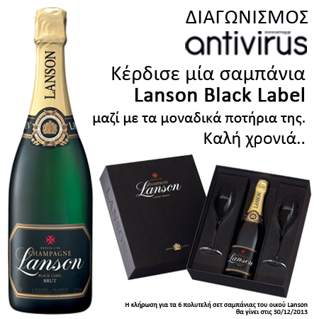 Tο περιοδικό Antivirus σε συνεργασία με τον οίκο Lanson δίνουν την δυνατότητα σε 6 τυχερούς /ες να κερδίσουν από ένα πολυτελή σετ σαμπάνιας* μετά από κλήρωση, για το καλωσόρισμα του νέου έτους.