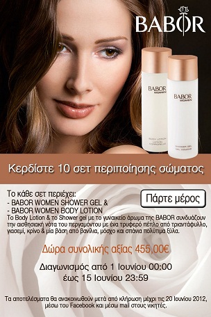Η σελίδα Babor Greece διοργανώνει διαγωνισμό και σας δίνει τη δυνατότητα να κερδίσετε 10 σετ περιποίησης σώματος, τα οποία περιλαμβάνουν το BABOR Women Shower Gel και το BABOR Women Body Lotion, συνολικής αξίας 45,50 € το καθένα. Δώρα συνολικής αξίας 455,00 €.