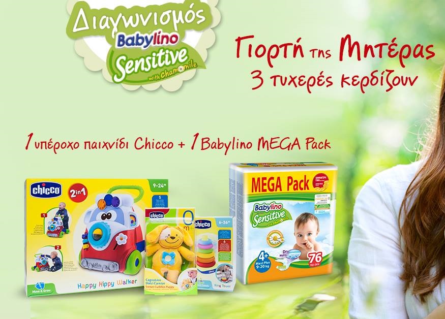 Η Babylino διοργανώνει διαγωνισμό και δίνει τη δυνατότητα σε 3 τυχερούς να κερδίσουν από μία συσκευασία βρεφικές πάνες Babylino Sensitive MegaPack και ένα παιχνίδι Chicco (Happy Hippy Walker για τον πρώτο νικητή, Sweet Cuddles Puppy για τον δεύτερο νικητή και Ring Tower για τον τρίτο νικητή)!