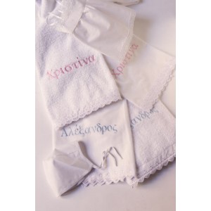• Σετ λαδόπανα cotton 100%. Διατίθεται σε λευκό, ή εκρού χρώμα. Περιλαμβάνει Πετσέτα βάπτισης με κεντημένο το όνομα του βρέφους και φινίρισμα από broderie δαντέλα