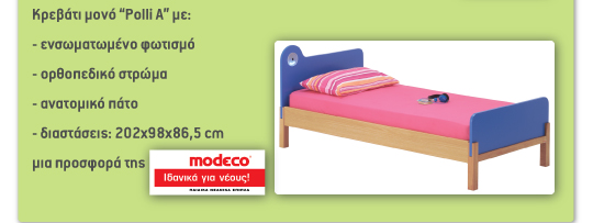 - 1 κρεβάτι μονό “Polli A” της Modeco με ενσωματωμένο φωτισμό, ανατομικό πάτο, ορθοπεδικό στρώμα και σιαστάσεις 202x98x86,5 cm.