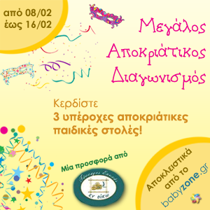Το babyzone.gr διοργανώνει μεγάλο αποκριάτικο διαγωνισμό και σας δίνει τη δυνατότητα να κερδίστε 3 υπέροχες παιδικές στολές.