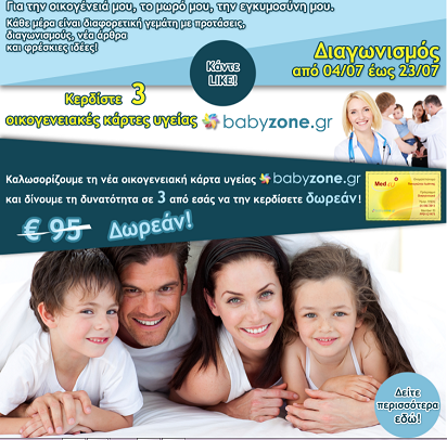 Το babyzone.gr διοργανώνει διαγωνισμό και δίνει τη δυνατότητα σε 3 τυχερούς να κερδίσουν από μία οικογενειακή κάρτα Υγείας Family Card του babyzone.gr, αξίας 95€ έκαστη.