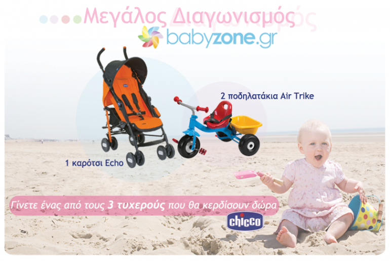 Το καλοκαιράκι είναι εδώ και σας δίνουμε υπέροχα δώρα για να περάσετε ξέγνοιαστες διακοπές με τα μικρά σας! Απαντήστε στις πολύ απλές ερωτήσεις του διαγωνισμού μας στο facebook και μπείτε στην κλήρωση για 1 καρότσι Echo & 2 ποδήλατα Air Trike της Chicco.