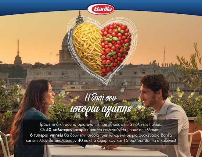 Η σελίδα Barilla Greece διοργανώνει το διαγωνισμό «Η δική σου ιστορία αγάπης».  Μπαίνοντας στην εφαρμογή οι συμμετέχοντες καλούνται να γράψουν τη δική τους ιστορία αγάπης, έτσι όπως τη βίωσαν σε μία πόλη της Ιταλίας με τον/την αγαπημένο/η τους. Η BARILLA θα επιλέξει 50 ιστορίες από τις οποίες θα προκύψουν με κλήρωση 6 τυχεροί, οι οποίοι θα δουν την ιστορία τους τυπωμένη σε μία συσκευασία BARILLA και επιπλέον θα λάβουν 40 πακέτα ζυμαρικών και 15 σάλτσες BARILLA o καθένας.