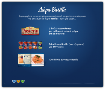 Η Barilla διοργανώνει το διαγωνισμό «Δημιουργήστε μια ιστορία αγάπης» και σας δίνει τη δυνατότητα να κερδίσετε 5 διπλές προσκλήσεις στη La Pasteria, 24 σάλτσες Barilla (του εξαμήνου) σε 10 νικητές και 100 βιβλία συνταγών Barilla.
