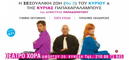 Η εκπομπή “Beautiful People” διοργανώνει διαγωνισμό και σας δίνει τη δυνατότητα να κερδίσετε 2 διπλές προσκλήσεις για την παράσταση “Η Σεξουαλική ζωή του Κου & της Κας Παπαχαραλάμπους” στο Θέατρο “Χώρα” Αμοργού 20, Κυψέλη.