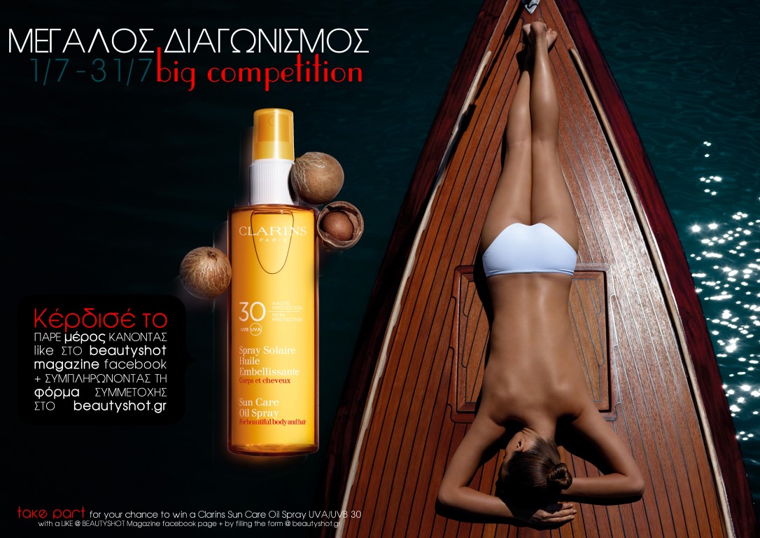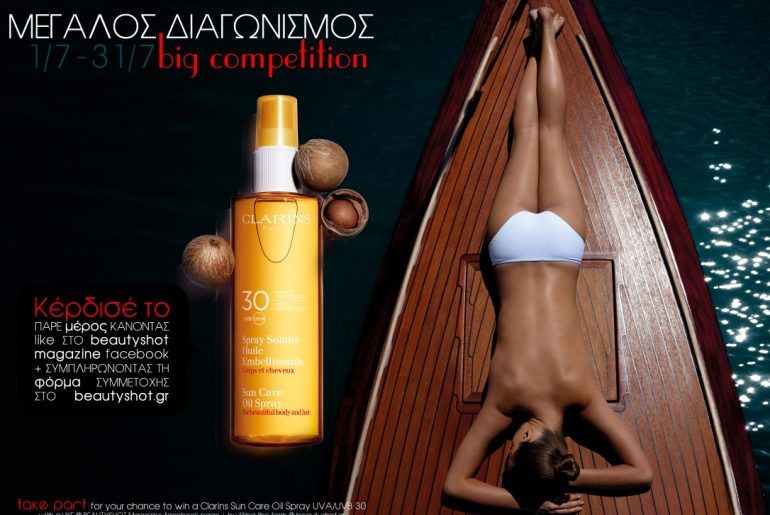 Το BEAUTYSHOT free online magazine διοργανώνει διαγωνισμό και σας δίνει τη δυνατότητα να κερδίσετε 1 αντηλιακό λάδι Clarins Sun Care Oil Spray UVA/UVB 30 για το σώμα και τα μαλλιά!