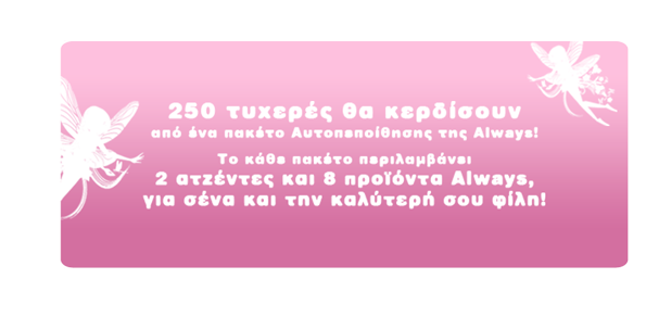 Το beinggirl.gr διοργανώνει διαγωνισμό και δίνει την ευκαιρία σε 250 τυχερές να κερδίσουν από ένα πακέτο αυτοπεποίηθησης της Always! Πιο συγκεκριμένα, το κάθε πακέτο περιλαμβάνει 2 ατζέντες και 8 προϊόντα Always.