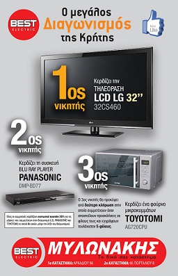 Το Best Electric Mylonakis διοργανώνει διαγωνισμό μόνο για κατοίκους Κρήτης και σας δίνει τη δυνατότητα να κερδίσετε 1 TV LCD LG 32’’ 32CS460 (1ος νικητής), μια συσκευή BLUE RAY PLAYER PANASONIC DMP-BD77 (2ος νικητής) και ένα φούρνο μικροκυμάτων TOYOTOMI AG720CPU (3ος νικητής ο οποίος θα προκύψει από δεύτερη κλήρωση στην οποία συμμετέχουν όσοι αποστείλουν προσκλήσεις σε φίλους τους και εγγράψουν τουλάχιστον 5 φίλους).
