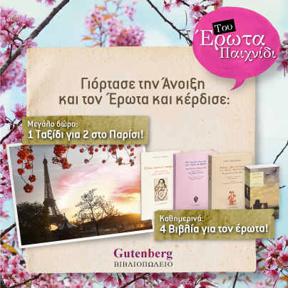 Το Βιβλιοπωλείο Gutenberg διοργανώνει διαγωνισμό και σας δίνει τη δυνατότητα να κερδίσετε ένα ταξίδι στο Παρίσι για δύο και καθημερινά, αριστουργήματα της ερωτικής ποίησης και λογοτεχνίας!