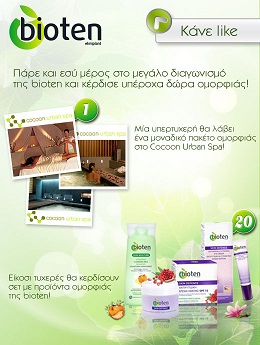 Η σελίδα bioten διοργανώνει διαγωνισμό και δίνει τη δυνατότητα σε ένα νικητή να κερδίσει ένα πακέτο ομορφιάς από το Cocoon Urban Spa και θα περιλαμβάνει: Μία περιποίηση προσώπου διάρκειας 45’, ένα μασάζ σώματος διάρκειας 55’, Jacuzzi, Σάουνα ή Χαμάμ. Οι επόμενοι 20 νικητές, θα λάβουν από ένα σετ προϊόντων το οποίο θα αποτελείται από: 1 αντιρυτιδική κρέμα ημέρας SKIN DEFENCE (για κανονικό/μικτό ή για ξηρό/ευαίσθητο), 1 γαλάκτωμα καθαρισμού προσώπου SKIN MOISTURE (για κανονικό/μικτό ή για ξηρό/ευαίσθητο) και 1 Αντιρυτιδική & Συσφικτική Κρέμα Ματιών SKIN DEFENCE (για όλους τους τύπους δέρματος).