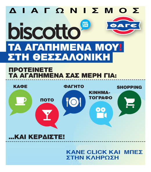 To Biscotto 2310 διοργανώνει διαγωνισμό στο facebook, σας ζητά να προτείνετε τα αγαπημένα σας μέρη για καφέ, ποτό, φαγητό, κινηματογράφο και shopping και σας δίνει τη δυνατότητα να κερδίσετε ένα δωρεάν Σαββατοκύριακο στο «EKIES RESORT» στη Χαλκιδική μαζί με το πρωινό για δύο άτομα.