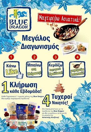 Η Blue Dragon διοργανώνει το διαγωνισμό «Μαγειρεύω Ασιατικά!» και σας δίνει τη δυνατότητα να κερδίσετε μία λαχταριστή συλλογή προϊόντων κάθε εβδομάδα.