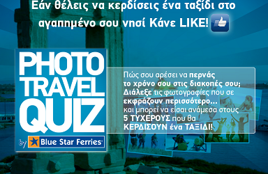 Επίλεξε τις φωτογραφίες που απεικονίζουν τις δικές σου ιδανικές διακοπές μέσα από ένα γρήγορο και διασκεδαστικό παιχνίδι, μάθε ποιος είναι ο ιδανικός προορισμός για εσένα & ΚΕΡΔΙΣΕ ένα ταξίδι στο αγαπημένο σου νησί από την Blue Star Ferries! Το δώρο είναι 5 ΤΑΞΙΔΙΑ 2 ατόμων στο νησί της επιλογής του νικητή!
