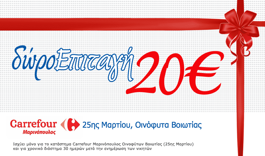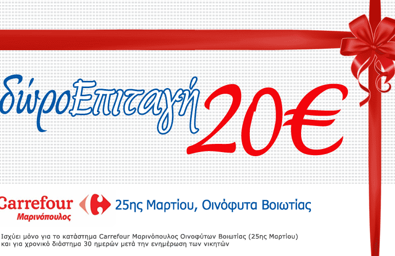 Η σελίδα Carrefour Mαρινόπουλος Οινόφυτα διοργανώνει διαγωνισμό και σας δίνει τη δυνατότητα να κερδίσετε 50 δωροεπιταγές αξίας 20€!