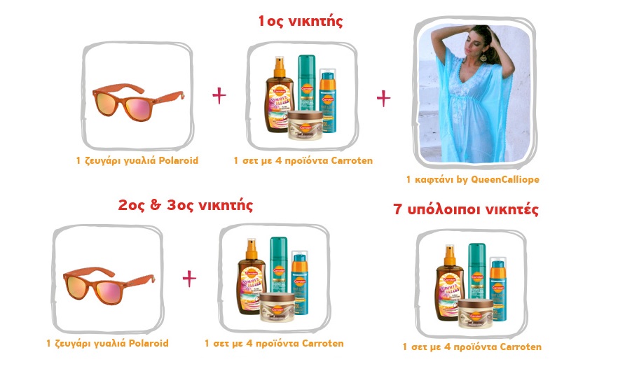 Ο πρώτος νικητής θα λάβει ως δώρο ένα καφτάνι by QueenCalliope, ένα ζευγάρι γυαλιά ηλίου Polaroid 6009 καθώς και ένα (1) σετ αποτελούμενο από τέσσερα (4) προϊόντα Carroten: