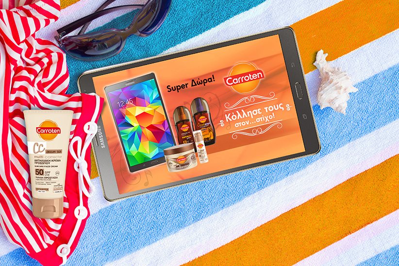 Το Carroten σας καλεί να παίξετε το παιχνίδι “Κόλλησέ τους στο…στίχο!” και δίνει τη δυνατότητα σε ένα μεγάλο νικητή να κερδίσει: 1 Samsung Galaxy Tab S 8,4, 1 Magic Tan & Protect Cream SPF10, 1 Superdry Oil SPF6, 1 Island Escape SPF0 και 1 BB divine care Face Cream SPF25. 9 ακόμα νικητές θα κερδίσουν από 1 σετ αποτελούμενο από τα παρακάτω 2 προϊόντα Carroten: Island Escape SPF0 και After Sun Moisturising Milk.