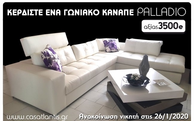 H εταιρεία Casatlantis Έπιπλα διοργανώνει διαγωνισμό και σας δίνει τη δυνατότητα να κερδίσετε ένα υπέροχο γωνιακό σαλόνι Palladio 3,0μ. x 2,5μ. με λευκό δέρμα, αξίας 3500€