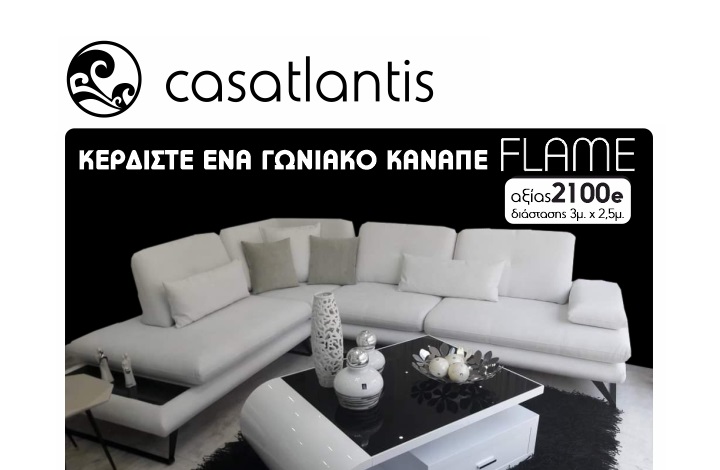 H εταιρεία Casatlantis Έπιπλα διοργανώνει διαγωνισμό και σας δίνει τη δυνατότητα να κερδίσετε έναν υπέροχο γωνιακό καναπέ Flame (3μ. x 2,5μ.) με λευκό ύφασμα, αδιάβροχο, αλέκιαστο, αξίας 2100€!
