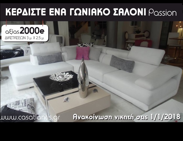 H εταιρεία Casatlantis Έπιπλα διοργανώνει διαγωνισμό και σας δίνει τη δυνατότητα να κερδίσετε ένα υπέροχο γωνιακό σαλόνι Passion αξίας 2000€, διαστάσεων 3μ. Χ 2,5μ!