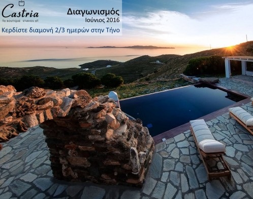 Tο Castria Boutique Studios Tinos διοργανώνει διαγωνισμό και σας δίνει τη δυνατότητα να κερδίσετε 2ήμερη (ή 3ήμερη) διαμονή για 2 άτομα στην Τήνο, σε studio τον Ιούνιο!