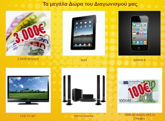 Το Cheapis.gr διοργανώνει διαγωνισμό και σας δίνει τη δυνατότητα να κερδίσετε 3000€ μετρητά, ipad, iphone4, τηλεόραση LCD 42”, Home Cinema, 100€ για αγορές από το cheapis.