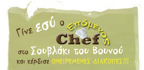 Στο εστιατόριο “Σουβλάκι του Βουνού” γίνεται ένας μεγάλος διαγωνισμό με τίτλο “Γίνε ο επόμενος Chef” ο οποιος στέλνει ένα τυχερό ζευγάρι για 5 ημέρες σε resort Ξενοδοχείο στην Κεφαλονιά.