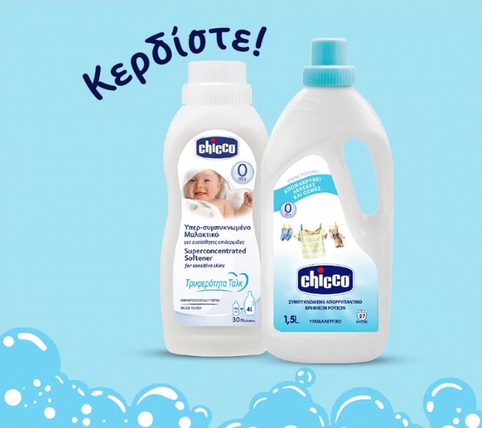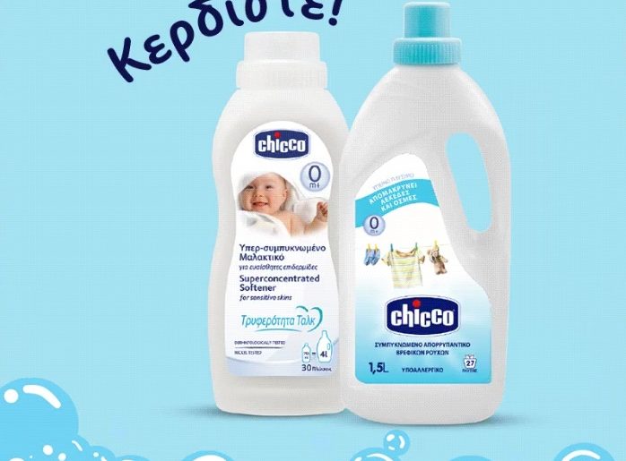 H Chicco διοργανώνει διαγωνισμό και δίνει τη δυνατότητα σε 6 τυχερούς να κερδίσουν από ένα συμπυκνωμένο απορρυπαντικό βρεφικών ρούχων και από 1 υπερσυμπυκνωμένο μαλακτικό «Ταλκ»!