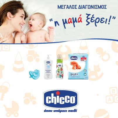 Η Chicco Greece διοργανώνει διαγωνισμό και σας δίνει τη δυνατότητα να κερδίσετε τα προϊόντα που επιθυμείτε: 4 γυάλινα μπιμπερό, για τους νικητές της κατηγορίας των μπιμπερών, από 4 πιπίλες από σιλικόνη σε χρώμα ροζ ή σιελ, για τους νικητές της κατηγορίας πιπίλα, από 2 αφρόλουτρα-σαμπουάν, για τους νικητές από τη κατηγορία Αφρόλουτρο-Σαμπουάν, από 2 συσκευασίες πάνας νούμερο 5 (κιλά 12-15),για τους νικητές από τη κατηγορία Πάνες.