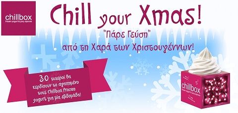 Chill your Xmas και “πάρε γεύση” από τη χαρά των Χριστουγέννων! Βρες και ταίριαξε τις ίδιες γεύσεις Chillbox frozen yogurt και μπες στην κλήρωση για να κερδίσεις το αγαπημένο σου Chillbox frozen yogurt για μία εβδομάδα. 30 τυχεροί κερδίζουν!