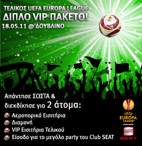 Το Club SEAT αξιοποιεί για μία ακόμη χρονιά την κορυφαία χορηγική συμφωνία της SEAT με το UEFA EUROPA LEAGUE και εξασφαλίζει για ένα τυχερό μέλος VIP πακέτο για να παρακολουθήσει τη μεγάλη αναμέτρηση του ΤΕΛΙΚΟΥ στο Δουβλίνο στις 18 Μαϊου του 2011 από κοντά!
