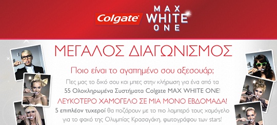 Η Colgate Greece διοργανώνει το διαγωνισμό Colgate ΜΑΧ WHITE ONE και δίνει τη δυνατότητα σε 5 τυχερούς να ποζάρουν με το πιο λαμπερό τους χαμόγελο, για το φακό της φωτογράφου των Stars Ολυμπίας Κρασαγάκη και να λάβουν για το αρχείο τους τις επαγγελματικές τους φωτογραφίες & ένα Σύστημα προϊόντων Colgate ΜΑΧ WHITE ONE και σε 55 ακόμη τυχερούς να κερδίσουν από ένα Σύστημα προϊόντων Colgate ΜΑΧ WHITE ONE.