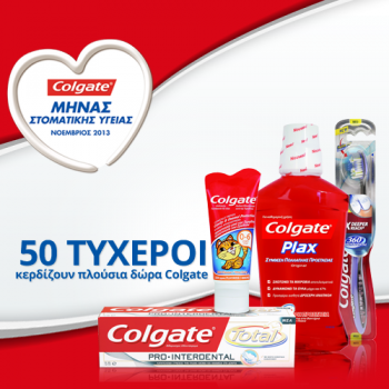 Η σελίδα Colgate Greece διοργανώνει διαγωνισμό και δίνει τη δυνατότητα σε 50 τυχερούς να κερδίσουν από ένα Kit με προϊόντα Colgate.