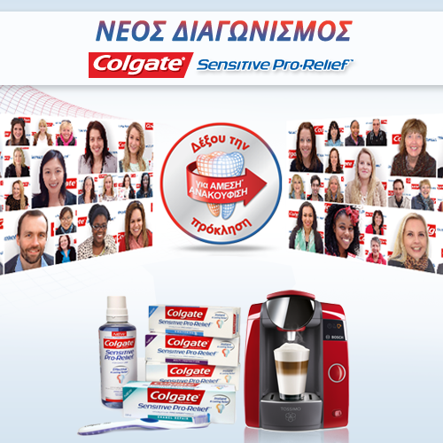 Η σελίδα Colgate Greece διοργανώνει διαγωνισμό και δίνει τη δυνατότητα στους 5 πρώτους τυχερούς να κερδίσουν μία πλήρως αυτόματη μηχανή TASSIMO JOY και ένα ολοκληρωμένο σύστημα προϊόντων Colgate® Sensitive Pro -Relief™ (το οποίο αποτελείται από μία οδοντόκρεμα, μία οδοντόβουρτσα και ένα στοματικό διάλυμα) και σε 50 επιπλέον τυχερούς να κερδίσουν από ένα ολοκληρωμένο σύστημα προϊόντων Colgate® Sensitive Pro -Relief™.