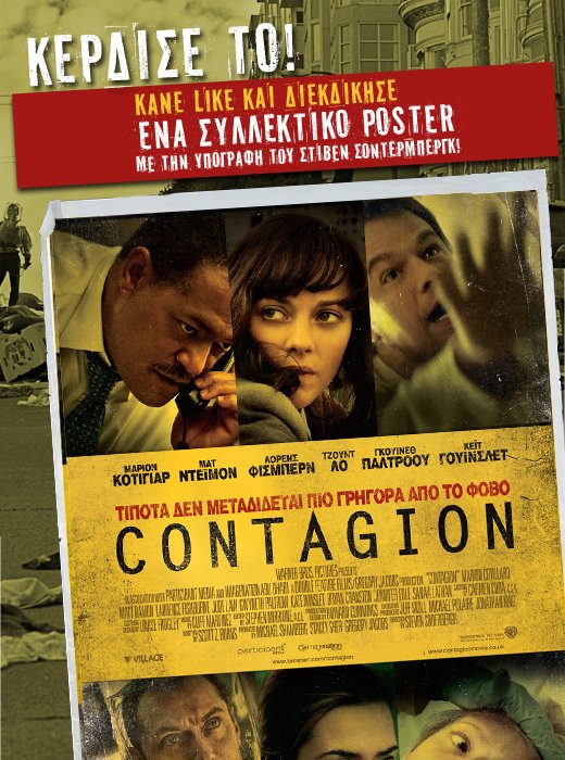 Το Contagion διοργανώνει διαγωνισμό στο facebook και σας δίνει τη δυνατότητα να κερδίσετε ένα συλλεκτικό poster από την ταινια Contagion με την υπογραφή του Στίβεν Σόντερμπεργκ.