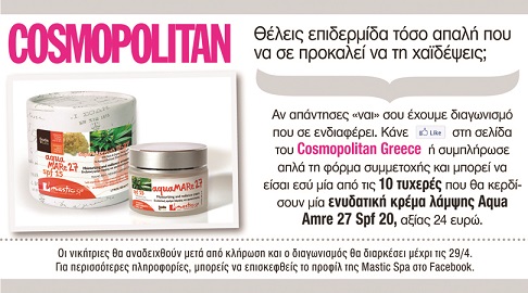Το Cosmopolitan Greece διοργανώνει διαγωνισμό και δίνει τη δυνατότητα σε 10 τυχερές να κερδίσουν μία ενυδατική κρέμα λάμψης Aqua Mare 27 Spf 20 της Mastic Spa.