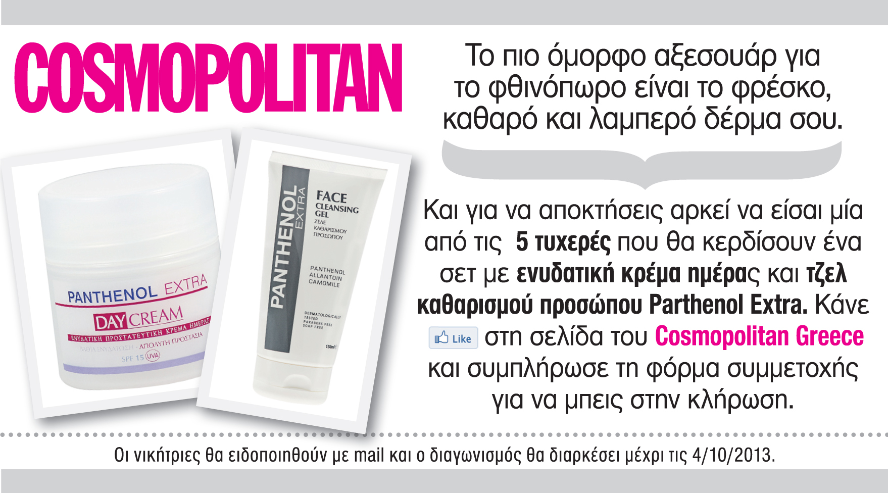 Το πιο όμορφο χαρακτηριστικό για το φθινόπωρο είναι το φρέσκο, καθαρό και λαμπερό δέρμα σου. Και για να αποκτήσεις αρκεί να είσαι μία από τις 5 τυχερές που θα κερδίσουν ένα σετ με ενυδατική κρέμα ημέρας και τζελ καθαρισμού προσώπου Panthenol Extra.