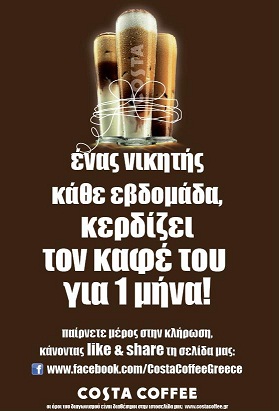 Διαγωνισμός Costa Coffee Greece με δώρο τον καφέ σας για ένα μήνα