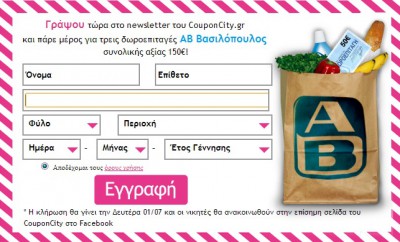 Το couponcity.gr διοργανώνει διαγωνισμό και σας δίνει τη δυνατότητα να κερδίσετε 3 δωροεπιταγές ΑΒ Βασιλόπουλος συνολικής αξίας 150€.