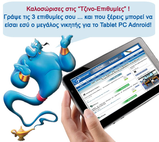 H Cydailynews.com διοργανώνει διαγωνισμό και χαρίζει σε έναν τυχερό αναγνώστη ένα Tablet PC Android. Η διαδικασία είναι απλή: Στέλνετε ένα σχόλιο με τις τρεις ευχές που θα θέλατε το “Τζίνι” μας να πραγματοποιήσει!