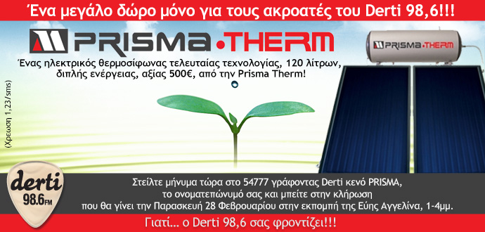 Ο Derti 98,6 & και η Prisma-Them διοργανώνουν διαγωνισμό και σας δίνουν τη δυνατότητα να κερδίσετε έναν ηλεκτρικό θερμοσίφωνα τελευταίας τεχνολογίας, 120 λίτρων, διπλής ενέργειας, αξίας 500€.