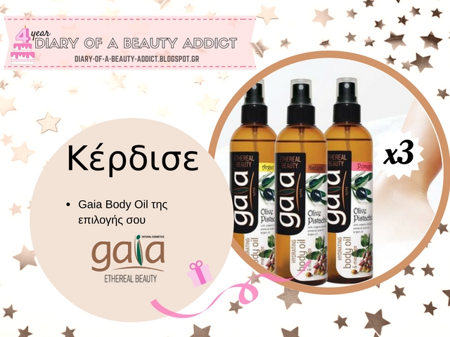 Το Diary Of A Beauty Addict διοργανώνει διαγωνισμό και σας δίνει τη δυνατότητα να κερδίσετε 3 Gaia Body & Massage Oil, με άρωμα της επιλογής σας!