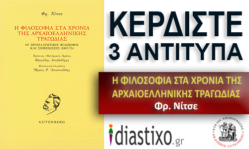 Το diastixo.gr σε συνεργασία με τις εκδόσεις Gutenberg, προσφέρει στους αναγνώστες του 3 αντίτυπα από το βιβλίο του Φρειδερίκου Νίτσε Η ΦΙΛΟΣΟΦΙΑ ΣΤΑ ΧΡΟΝΙΑ ΤΗΣ ΑΡΧΑΙΟΕΛΛΗΝΙΚΗΣ ΤΡΑΓΩΔΙΑΣ.