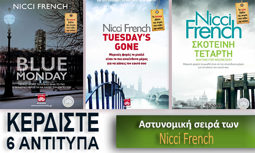 Το diastixo.gr σε συνεργασία με τις εκδόσεις Διόπτρα, προσφέρει στους αναγνώστες του 6 βιβλία της αστυνομικής σειράς των Nicci French: BLUE MONDAY, TUESDAY’S GONE, ΣΚΟΤΕΙΝΗ ΤΕΤΑΡΤΗ.