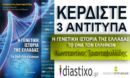 Το diastixo.gr σε συνεργασία με τις εκδόσεις Κυριακίδη, προσφέρει στους αναγνώστες του 3 αντίτυπα από το βιβλίο του καθηγητή Κωνσταντίνου Τριανταφυλλίδη Η ΓΕΝΕΤΙΚΗ ΙΣΤΟΡΙΑ ΤΗΣ ΕΛΛΑΔΑΣ – ΤΟ DNA ΤΩΝ ΕΛΛΗΝΩΝ.