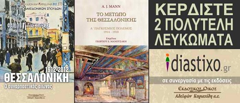 Το diastixo.gr σε συνεργασία με τις εκδόσεις των Αδελφών Κυριακίδη, προσφέρει στους αναγνώστες του 2 πολυτελή λευκώματα: «Θεσσαλονίκη 1912-2012. Ο συναρπαστικός αιώνας» του Φαίδωνα Γιαγκιόζη και «Το μέτωπο της Θεσσαλονίκης. Α΄ Παγκόσμιος Πόλεμος 1914-1918» του A. J. Mann.