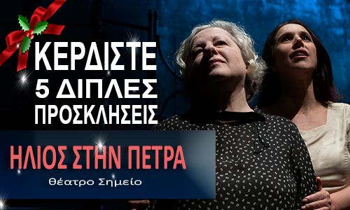Το diastixo.gr διοργανώνει διαγωνισμό και σας δίνει τη δυνατότητα να κερδίσετε 5 διπλές προσκλήσεις, για το έργο της Σοφίας Αδαμίδου ΗΛΙΟΣ ΣΤΗΝ ΠΕΤΡΑ, για την παράσταση της Κυριακής 22 Δεκεμβρίου στις 19:00.